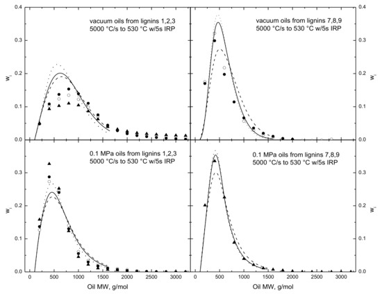 Figure 4 compares simulated and measured oil MWDs for the same test conditions as Figure 3 with the two lignin triplets, whose raw MWDs appear in Figure 1. As seen in Figure 1, the triplet MWDs denoted as 1/2/3 extend to much heavier weights than those for triplet 7/8/9. Each case has the oil MWDs from the whole lignin plus its light and heavy fractions. The reported and simulated oil MWDs pass through maxima around 500 g/mol, then gradually relax in long tails extending to much heavier molecular weights, as in gamma distribution functions. The simulated MWDs are shifted toward heavier weights for the heavier lignin in each triplet, as seen in the measured MWDs. The simulated MWDs are particularly accurate for the oils from triplet 7/8/9 at both test pressures. Those from triplet 1/2/3 overestimate the maxima under vacuum and underestimate the maxima at atmospheric pressure. Some of the discrepancies should be attributed to a deliberate truncation of the simulated oil MWDs at 2000 g/mol. This author is skeptical that the MWDs of vaporized organic oils can extend to 5000 g/mol and suspects that non-exclusion effects in GPC for highly polar macromolecules such as bio-oils may be responsible for the extended tails. This truncation necessarily steepens the lighter portion of the vacuum oil MWDs from triplet 1/2/3. However, the excessive tail is absent from the reported vacuum MWDs from the lighter triplet and from both triplets at 0.1 MPa, for which the MWDs are accurate across the entire lignin weight range. Overestimates for the increments of intermediate molecular weights in the lignin MWDs in Figure 1 do not carry over to the oil MWDs, because the FDA introduces independent dependences on oil weight, temperature, and pressure.