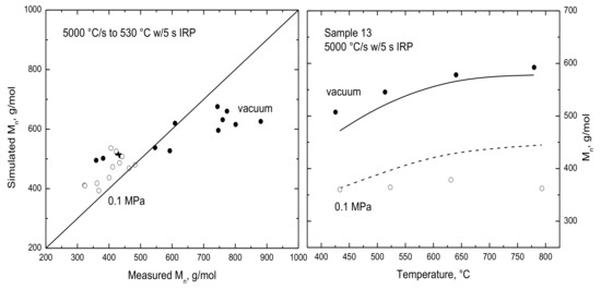 Number-average molecular weights for the 14 lignins in Marathe et al.’s dataset are evaluated for both test pressures in Figure 5. The simulated oil weights are accurate at atmospheric pressure but the truncation of the vacuum MWDs described above is responsible for the underprediction for the heaviest vacuum oils. Notwithstanding, the simulated Mn under vacuum of oils increases for progressively hotter temperatures in close agreement with the reported temperature dependence, which corroborates the temperature dependence in the FDA. The simulated temperature dependence is weaker for atmospheric oils but does not vanish like it does in the reported Mn values. According to the FDA, oil MWDs become lighter at progressively higher pressures because the longest volatile chains no longer have sufficient volatility to vaporize from the condensed phase (because the oil production rate is proportional to the ratio of the vapor pressure of each chain size to the ambient pressure [1]). Consequently, the cumulative oil sample becomes enriched in the lightest oil chains while the longer chains remain in the condensed phase where they are susceptible to recombinations that make them longer and therefore even less volatile.