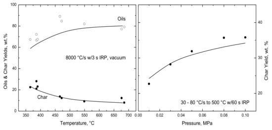 Zhou et al. [10] used a WMR to monitor gas, oil, and char yields from one lignin for 8000 °C/s to 365–685 °C with 3 s IRP under vacuum. They also monitored the MWDs of lignin and oils, albeit without a quantitative calibration, so these MWDs will not be considered. The mass balances closed to within ±6 wt.% but only for temperatures cooler than 500 °C, which is attributed to oil decomposition at hotter temperatures. Pecha et al. [11] used a modified pyroprobe reactor to determine char yields for 60 s at 500 °C under pressures from 0.01 to 0.10 MPa. Across this pressure range, the heating rates varied from 30 to 80 °C/s.