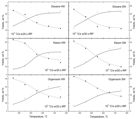 Evaluation of simulated yields of (dashed curves) char and (solid curves) oils/H2O/OXYs/H2 with measured (●) char and (◯) condensables yields from Custodis et al. [12] for rapid heating with 20 s IRP on lignins from three recovery processes applied to (left) hardwood and (right) softwood.