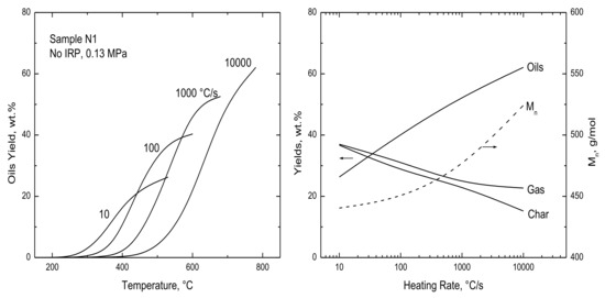 Simulated (left) oil production and (right) ultimate yields of (solid curves) gas, oils, and char and (dashed curve) oil Mn-values for four heating rates with no IRPs at 0.13 MPa.