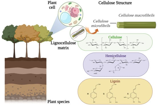 Cellulose (C6H10O5)n is the most abundant renewable natural polymer in nature. In general, lignocellulose-based biomaterials have a large proportion of total cellulose content, highly interlaced by a significant amount of covalent bonds with high rigidity to form extremely strong and resilient components []. Generally, cellulose from algae is approximately 70 wt% and cellulose from plant-based materials ranges from 40 to 60 wt% []. Nonetheless, some studies indicate that the cellulose content in some plants, such as hop stems, can reach 70 wt%, which allows the substance to be widely used for biopolymer production and applications []. Spontaneously, cellulose molecules form large agglomerates that aggregate into microfibrils, which are constituents commonly called crystalline and amorphous zones []. The structure of the multiple components that comprise the complex are presented in Figure 1. The structure of cellulolytic chains is made up of cellulose microfibrils, intimately intertwined in complexes based on lignin and hemicellulose.