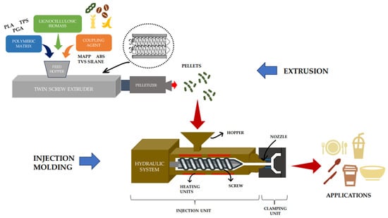 Extrusion and injection molding are widely used manufacturing technologies in the plastics industry []. By leveraging this technology, biomass can be transformed into high-quality polymeric materials with desirable properties. Extrusion involves the continuous melting, mixing, and shaping of the biopolymers, while injection molding enables the precise and efficient formation of complex shapes through the injection of molten materials into molds [].