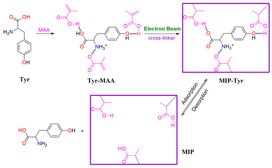Thus, the effective and clean EB radiation polymerization was developed for the fabrication of L-Tyr MIPs in this work. Then, the obtained L-Tyr MIPs were characterized by a series of techniques, and adsorption performance was determined under different conditions. Finally, the adsorption mechanism and recognition property were also investigated.