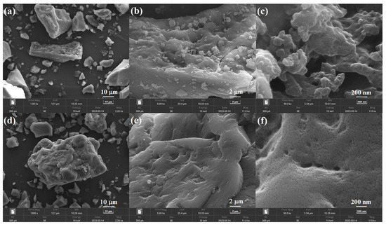 The morphology of the L-Tyr MIP and NIP were revealed by SEM and are shown in Figure 2. As shown in Figure 2a,d, the MIP and NIP are particles, and the NIP has a larger size than that of MIPs. Compared with the high-resolution image of NIP (Figure 2e,f), a rougher surface and many cavities were observed for images of MIP, which are beneficial for the adsorption and recognition of L-Tyr. The formation of a rough surface and porous structure can be assigned to the different preparation processes of MIP and NIP [11,14], template-functional monomer complexes were formed in the fabrication of MIP, and a porous structure appeared after the removal of the template. In addition, the formed cavities are complementary in binding sites, shape, and size to the template.