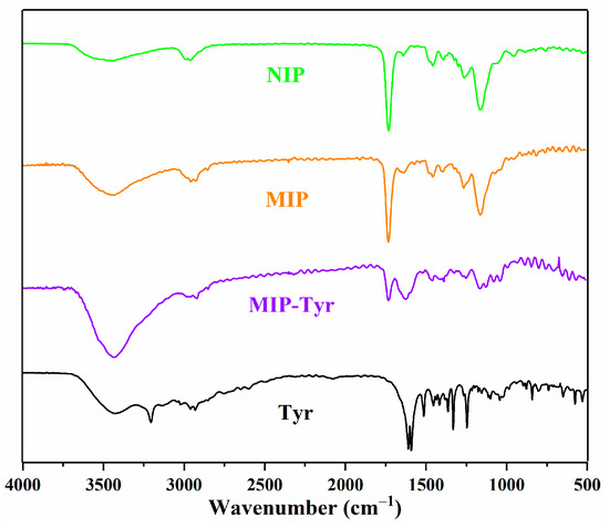 The chemical structure of L-Tyr, MIP-Tyr, MIP, and NIP were demonstrated with FTIR spectroscopy and are presented in Figure 3. For the spectra of L-Tyr, a broad peak from 3300 to 3600 cm−1 belonged to the vibration of -OH (carboxylic acid and phenol hydroxyl), and 3207 cm−1 was the vibration peak of -NH2. In addition, 2965 and 2967 cm−1 belonged to the C-H vibration of the aliphatic chain, and peaks at 1620 and 1588 cm−1 were assigned to the antisymmetric and symmetric vibrations of C=O. Values of 1517, 1457, and 1420 cm−1 were assigned to the skeleton vibration of the aromatic ring [25,26]. For the MIP-Tyr, 3431 cm−1 was assigned to the vibration of -OH, and 1728 cm−1 was assigned to the C=O originating from the functional monomer MAA and cross-linker EGDMA. An obvious C=O vibration peak for L-Tyr was also observed at 1623 cm−1, demonstrating the successful fabrication of the L-Tyr-loaded MIP [19,27]. For the spectra of MIP, the C=O vibration of L-Tyr disappeared, revealing the successful removal of the template molecule. In addition, no obvious difference was observed for the obtained NIP and MIP, which further demonstrated the successful preparation of the MIP.