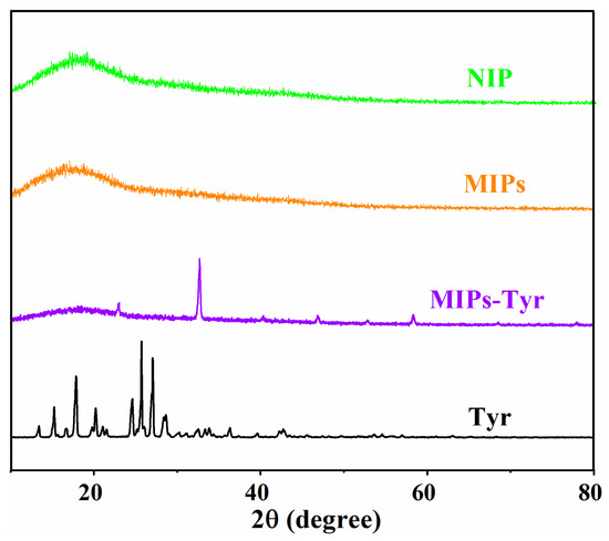 The crystal structure of L-Tyr, MIP-Tyr, MIP, and NIP were demonstrated with XRD spectroscopy and are presented in Figure 4. As shown in Figure 4 sharp peaks at 15.2°, 17.9°, 20.1°, 24.5°, 25.7°, 27.0°, and 28.6° suggest the crystal structure of L-Tyr [28,29]. For the MIP-Tyr, only one sharp peak at 32.7° was observed, indicating the decrease of the crystalline degree of L-Tyr and the uniform dispersion of L-Tyr into the polymeric matrix [30]. For the XRD patterns of MIP and NIP, only broad peaks were observed at 17.1° and 17.6°, revealing the amorphous structure of polymeric materials [31]. In addition, the disappearance of the sharp peak also demonstrated the successful removal of the template molecule.
