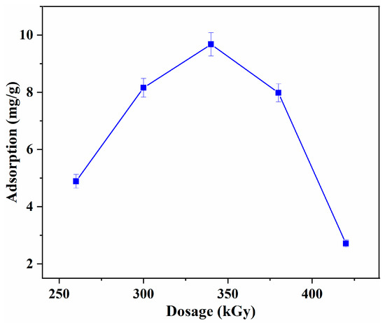 Since the EB irradiation polymerization obeys the radical polymerization mechanism, the irradiation dosage is the key parameter to the structure and performance of the obtained L-Tyr MIPs because it determines the number of radicals. The influence of absorbed dosage on the adsorption capacity of L-Tyr was investigated first, and the results are presented in Figure 6. With the increase of absorbed dosage, the adsorption capacity increased, and the maximum capacity of 9.67 mg/g was observed at 340 kGy. Further increasing the irradiation dosage leads to the decrease of adsorption capacity, and this can be ascribed to the irradiation dosage having an important influence on the structure of the obtained L-Tyr MIPs. When the irradiation dosage is low, the polymerization rate is very slow and the binding site number in the MIPs is reduced due to the low degree of cross-linking. On the contrary, when the irradiation dosage is high, the polymerization rate is very fast, leading to a high degree of cross-linking and serious blocking of binding sites, which is unfavorable to the mass transfer process, thus greatly reducing the adsorption capacity [18,19]. Hence, the sample obtained at 340 kGy was chosen for further investigation.
