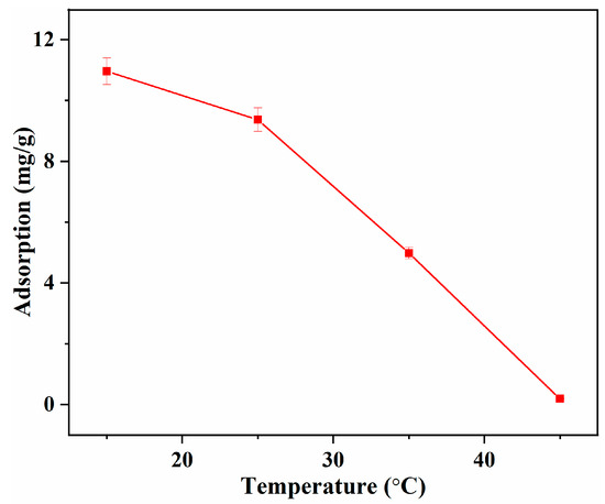 To reveal the energy changes in the adsorption process, the influence of temperature on the adsorption capacity of L-Tyr was investigated, and thermodynamic parameters were calculated according to the result. As presented in Figure 7, the adsorption capacity decreased dramatically with the increase of temperature, indicating the exothermic nature of the process [34]. The maximum capacity of 10.96 mg/g was obtained at 15 °C, which is just a little higher than the adsorption capacity at 25 °C. Though low temperature is favorable for the improvement of adsorption capacity, taking the accessibility of real operation and energy consumption into account, the following investigation was conducted at 25 °C.