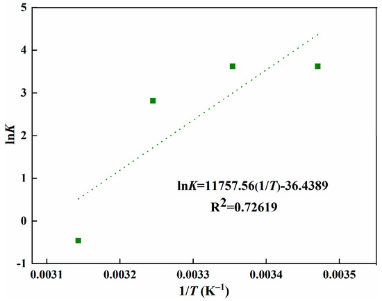 Based on the results of temperature effect on the adsorption, thermodynamic parameters of ΔG0, ΔH0, and ΔS0 were calculated according to Equations (2)–(4) [21,34,35,36]. As shown in Figure 8, ΔH0 and ΔS0 were calculated from the linear plot of lnK versus 1/T, and all of the calculated results are listed in Table 1.