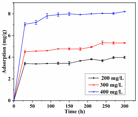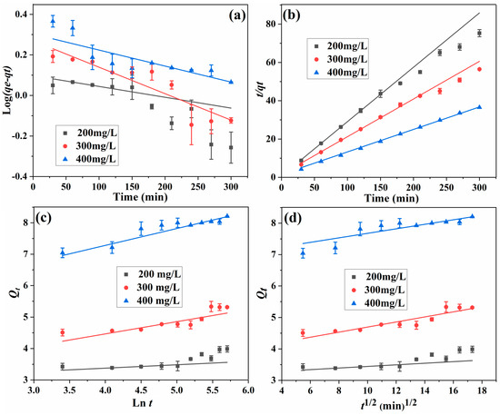 The influence of adsorption time on the capacity was evaluated with the concentrations of 200, 300, and 400 mg/L. The kinetics were investigated with predetermined intervals within 0–5 h. Pseudo-first-order (PFO), pseudo-second-order (PSO), Elovich, and Weber–Morris (intraparticles diffusion, IPD) kinetics models were used to assess the kinetic process, and corresponding kinetic parameters were calculated by Equations (5)–(8) [16,22,23,24]: