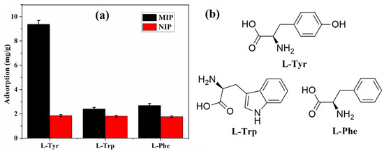 To reveal the selectivity or recognition property of the obtained MIP, adsorption experiments were conducted with L-Tyr and analogues (L-Trp, L-Phe). As shown in Figure 11a, the maximum capacity of L-Tyr is much higher than those of L-Trp (2.40 mg/g) and L-Phe (2.68 mg/g), which indicates that the formed cavity in the L-Tyr MIP can especially recognize L-Tyr [13,42]. Although the analogues have a similar structure and functional groups with L-Tyr (Figure 11b), the molecular size is different, which makes the difference in adsorption capacity.