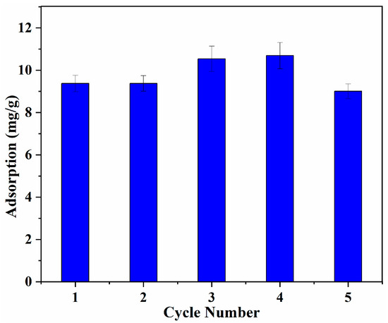 The regeneration property of MIPs is crucial in practical industrial application. The reusability and the stability of the obtained MIP was determined by measuring the adsorption capacity of the MIP for L-Tyr repeatedly after each adsorption-desorption cycle under the same conditions [38,40]. The adsorption capacity of the MIP, which was reused five times, is shown in Figure 12, which demonstrates that the obtained MIP has excellent stability with a negligible decrease in adsorption capacity. The adsorption efficiency only lost about 4% after five adsorption-desorption cycles, which shows a promising application in L-Tyr separation [12,16].