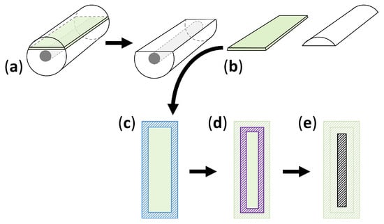 Sampling scheme for the profile analysis of the cylinders (dimensions: 30 mm (L); Ø = 10 mm). The greenish area indicates the position of the around 0.5 mm thick slice, which was used for the surface depths profile analysis (a). Therefore, the cylinder was sectioned breadthwise manually with a saw. The resulting slice (b) was then further segmented into the surface (c, blue hachure), 2 mm depths (d, purple hachure), and core (e, black hachure).