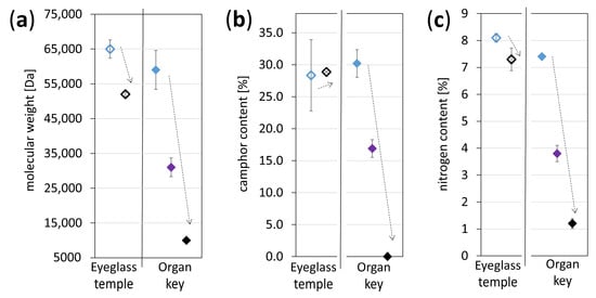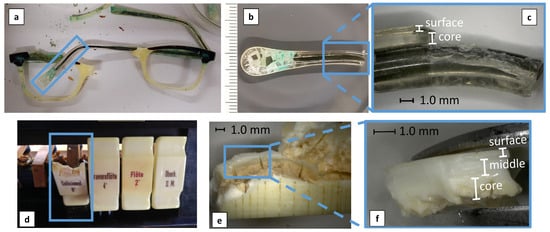 Two historical artifacts were selected for the depth profile analyses. The first was a transparent eyeglass temple from the 1950s/1960s (Figure 3a–c), formerly belonging to the optical collection of the DM. However, those objects were removed from the inventory due to their advanced state of alteration. The second case study was a key former part of an organ situated in a Bavarian church (Figure 3d–f), and similar to the previous case, it was taken away due to its severe state of degradation.