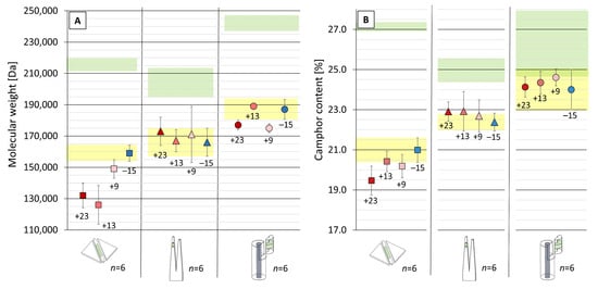 Bulk analyses of molecular weight (A) and camphor content (B) for the mock-ups (□ sheets, Δ tines, o cylinders) after seven months of storage at different temperatures. The green and yellow areas display the range of average values of Mw and camphor contents corresponding to unaged and aged mock-ups before storage, respectively. For more details, please consider Section 2.6.