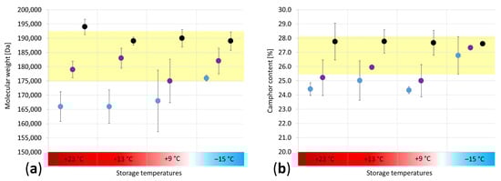 Depth profile analyses of the molecular weight distribution (a) of the camphor content (b) for the cylinders after seven months of storage at four different temperatures (blue = surface, violet = 2 mm depths, black = core). The yellow area marks the values achieved at −15 °C between the surface and core.