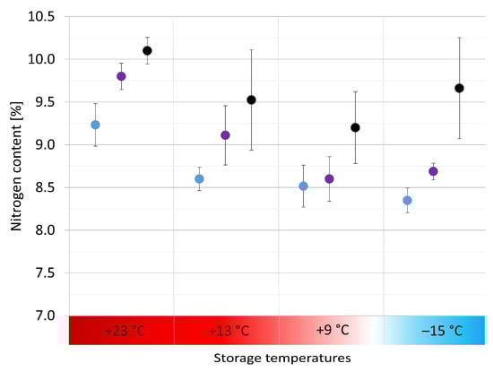 Calculated nitrogen content in depth profile (blue = surface, violet = 2 mm depths, black = core) after seven months of storage at four different temperatures.