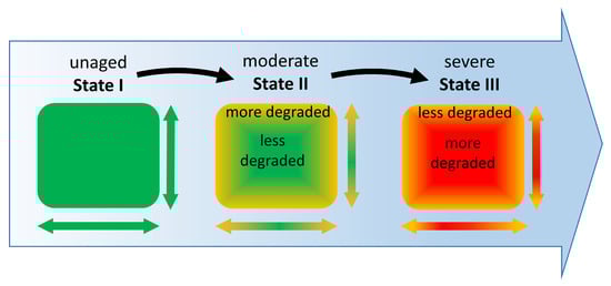 Possible schematic evolution of 3D-CN cross-sections with increasing aging, showing degradation gradients along the depth and width. In naturally aged objects several regions may have different conditions and gradients simultaneously.
