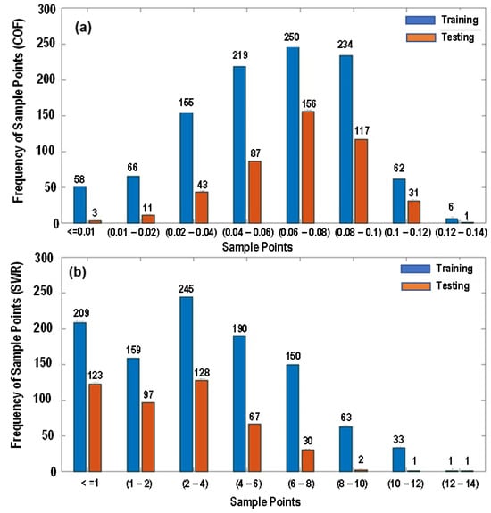 - The dataset was partitioned into 2 components as 70% of the samples were used to train the models, while the remaining 30% were used as an unseen test set for models to predict values. Figure 1a and Figure 1b show the frequency of the training and the testing dataset for the COF and SWR, respectively.