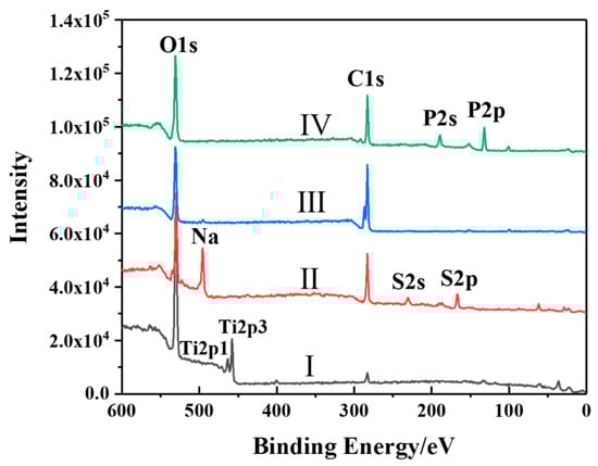 The surface information of Ti6Al4V before and after being modified by different polymers was analyzed using XPS. Figure 2 presents typical XPS survey scans over a binding energy in the range of 0 to 600 eV. Line I in Figure 2 represents the typical XPS survey of the Ti6Al4V surface before modification. Lines II, III and IV indicate the typical XPS surveys of the surfaces of PVS-modified Ti6Al4V, PAA-modified Ti6Al4V and PVPA-modified Ti6Al4V, respectively. To illustrate a stark contrast, the ordinate values were successively shifted upwards by 30,000 from the second line. Compared with Line I, the disappearance of titanium peaks and the increase in carbon peaks in Line II, III and IV confirmed that the Ti6Al4V surfaces were successfully modified. However, the appearance of Na and S peaks in Line II and P peak in Line IV proved the existence of PVS and PVPA molecules on the Ti6Al4V surface.