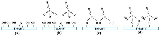 (a) Heat−treated Ti6Al4V surface; (b) reaction of sulfonate groups with heat-treated Ti6Al4V surface; (c) reaction of carboxy groups with heat-treated Ti6Al4V surface; (d) reaction of phosphate groups with heat-treated Ti6Al4V surface.