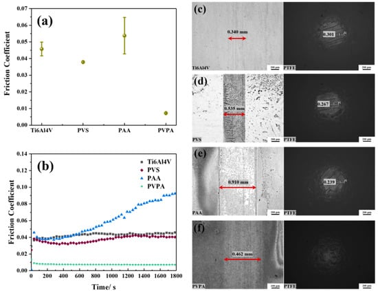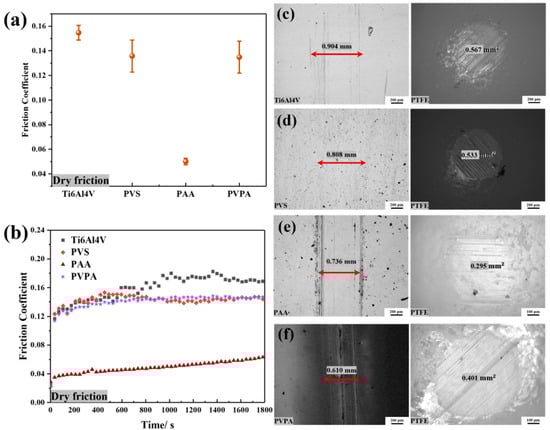 Tribological properties of the bare and polymer-modified Ti6Al4V under dry friction: (a) the average friction coefficient; (b) the friction coefficient versus time; (c) wear morphologies of the bare Ti6Al4V and the PTFE ball; (d) wear morphologies of the PVS-modified Ti6Al4V and the PTFE ball; (e) wear morphologies of the PAA-modified Ti6Al4V and the PTFE ball; (f) wear morphologies of the PVPA-modified Ti6Al4V and the PTFE ball.