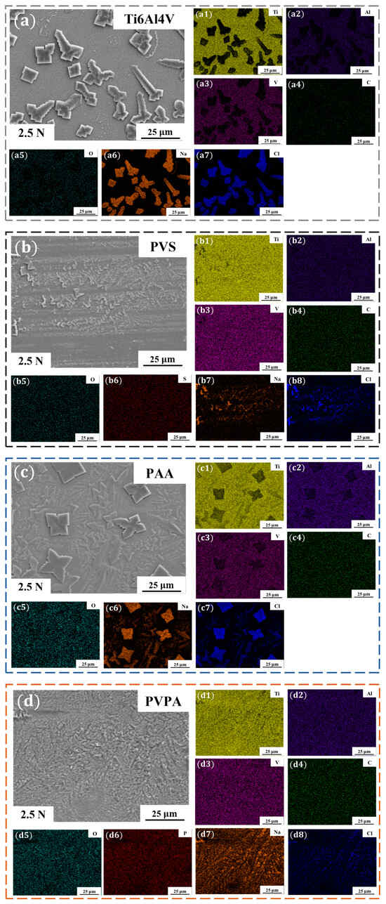 (a) Morphology of the bare Ti6Al4V wear area; (a1–a7) EDS mapping in the region of (a); (b) morphology of the soaked PVS-modified Ti6Al4V; (b1–b8) EDS mapping in the region of (b); (c) morphology of the soaked PAA-modified Ti6Al4V; (c1–c7) EDS mapping in the region of (c); (d) morphology of the soaked PVPA-modified Ti6Al4V; (d1–d8) EDS mapping in the region of (d).