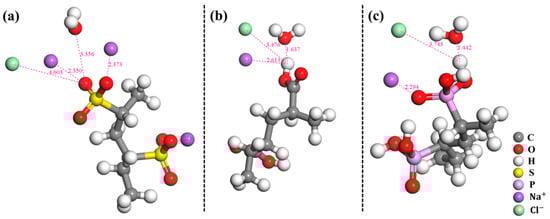 The external environment of the polymer coatings in the friction process was the NaCl solution, and the components contained in the system models should include the polymer molecular chain, the water molecule, Na+ and Cl−. Interactions between polymer molecular chains and the NaCl solution mainly included interactions with Na+, Cl− and the water molecule, which could be analyzed by DFT calculations. An amorphous MS module was used to construct the molecular models of PVS, PAA, PVPA and water, as well as the ion models of Na+ and Cl−. The polymerization degrees of PAA, PVS and PVPA molecular chains were all n = 2. The Forcite module was used to optimize these models. The polymer coating surface was simplified to some extent when constructing the system mode. One Na+, one Cl− and one optimized water molecule were placed on the optimized polymer molecular chain to form the system model. The adsorptions of salt ions and water molecules on the polymer molecular chain were approximated to their adsorptions on the polymer coating surface. DFT calculation with the Dmol3/GGA-PBE/DNP basis set was performed to optimize the convergence of energy charge, displacement and force. The interaction models of DFT-optimized PVS, PAA and PVPA molecular chains with salt ions and surrounding water molecules are shown in Figure 8a, b and c, respectively. It can be seen that the shortest distances between salt ions and the water molecule to polymer molecular chains were their distances to the special functional groups of the polymer molecular chains. Therefore, it can be considered that salt ions and water molecules mainly interact with special functional groups of polymer molecular chains.