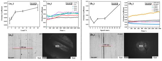 Tribological properties of the bare Ti6Al4V under different loads and at different velocities: (a1) the average friction coefficients under different loads; (a2) the friction coefficients versus time under different loads; (a3) wear morphologies of the bare Ti6Al4V and the PTFE ball under the load of 40 N; (b1) the average friction coefficients under different velocities; (b2) the friction coefficients versus time under different velocities; (b3) wear morphologies of the bare Ti6Al4V and the PTFE ball at the velocity of 24 mm/s.