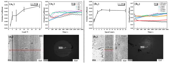 Tribological properties of the PVS-modified Ti6Al4V under different loads and at different velocities: (a1) the average friction coefficients under different loads; (a2) the friction coefficients versus time under different loads; (a3) wear morphologies of the PVS-modified Ti6Al4V and the PTFE ball under the load of 40 N; (b1) the average friction coefficients under different velocities; (b2) the friction coefficients versus time under different velocities; (b3) wear morphologies of the PVS-modified Ti6Al4V and the PTFE ball at the velocity of 24 mm/s.