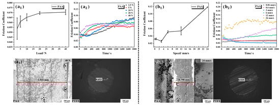 Tribological properties of the PAA-modified Ti6Al4V under different loads and at different velocities: (a1) the average friction coefficients under different loads; (a2) the friction coefficients versus time under different loads; (a3) wear morphologies of the PAA-modified Ti6Al4V and the PTFE ball under the load of 40 N; (b1) the average friction coefficients under different velocities; (b2) the friction coefficients versus time under different velocities; (b3) wear morphologies of the PAA-modified Ti6Al4V and the PTFE ball at the velocity of 24 mm/s.
