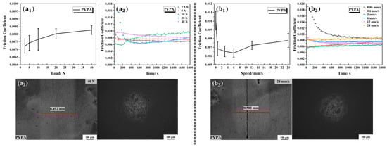 Tribological properties of the PVPA-modified Ti6Al4V under different loads and at different velocities: (a1) the average friction coefficients under different loads; (a2) the friction coefficients versus time under different loads; (a3) wear morphologies of the PVPA-modified Ti6Al4V and the PTFE ball under the load of 40 N; (b1) the average friction coefficients under different velocities; (b2) the friction coefficients versus time under different velocities; (b3) wear morphologies of the PVPA-modified Ti6Al4V and the PTFE ball at the velocity of 24 mm/s.
