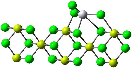 A molecular electrostatic potential (MEP) map was also generated to visualize the electrical charge distribution of each of the compounds of interest. In addition, the UKA FOKUI 2.00 software was used to calculate values of chemical descriptors and local reactivity properties. These calculations provide detailed information about the local characteristics and reactivity of methanol and H2S, providing a deeper understanding of their chemical behavior and properties. Simulations of the UV–vis spectra of the catalyst were performed; for this, simplified structural models of nanoclusters were proposed by Takasao et al. These patterns were obtained by selectively removing TiClx units from the proposed nanoclusters. Then, the simplified nanoclusters were reoptimized using density function theory (DFT) with the B3LYP level of view and the def2-TZVP base set. The following was considered regarding the proposed structural model: a Ti cation coordinated with six ligands on the MgCl2(110) surface, considered the most representative representation of Ti sites in ZN catalysts. This model was used as the basis for the simulation of the UV–vis spectrum. In Figure 2, the Mg atoms are represented in yellow, the Cl atoms in green, and the Ti atoms in grey. These models were obtained from the structures of TiCl4-coated MgCl2 nanoplates, previously determined by Takasao et al. Dashed lines indicate MgCl2 surfaces that are involved in TiClx chemisorption.