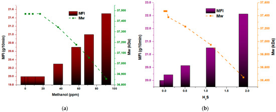 (a) Melt flow index and Mw of methanol; (b) melt flow index and Mw of H2S.