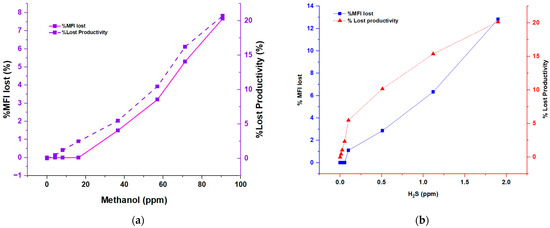 (a) Graph of the percentage of MFI lost and loss of catalyst productivity in the presence of methanol; (b) graph of the percentage of MFI lost and loss of catalyst productivity in the presence of H2S.