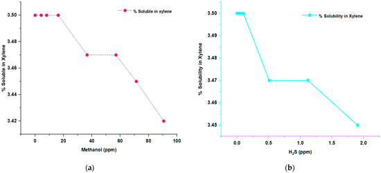 (a) Graph of the solubility in xylene and the selectivity control agent in the presence of methanol; (b) graph of the solubility in xylene and the selectivity control agent in the presence of H2S.