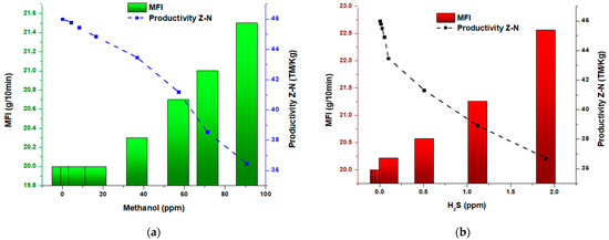 (a) Graph of MFI vs. Productivity of the Ziegler–Natta catalyst in methanol bulk; (b) graph of MFI vs. Productivity of the Ziegler–Natta catalyst in H2S presence.