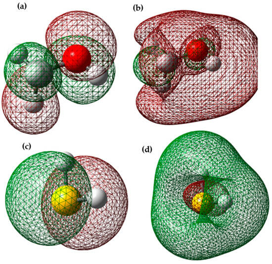 (a) Highest occupied molecular orbital (HOMO) of methanol; (b) lowest unoccupied molecular orbital (LUMO) of methanol; (c) highest occupied molecular orbital (HOMO) of H2S; (d) lowest unoccupied molecular orbital (LUMO) of H2S.
