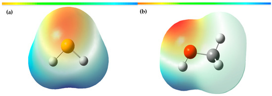 (a) Total density mapped to the electrostatic surface of H2S; (b) total density mapped to the electrostatic surface of methanol.