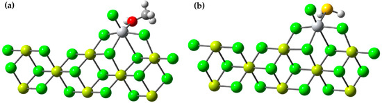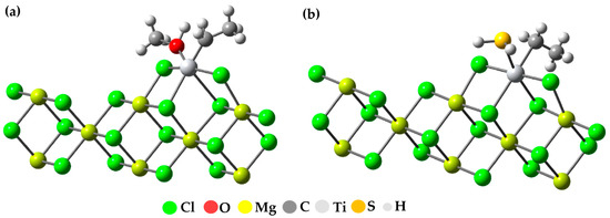 (a) Adsorption of a molecule of methanol onto the active center of the Ziegler–Natta catalyst; (b) adsorption of a molecule of H2S onto the active center of the Ziegler–Natta catalyst. The chlorine atoms are identified by the color green, the magnesium in yellow, the oxygen atom in red, the sulfur atom in ocher yellow, the titanium atom in gray and the carbon atoms in light gray.