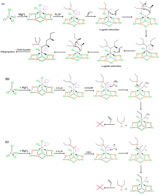(a) Polymerization mechanism of propylene in the presence of triethylaluminum and Ziegler–Natta catalyst; (b) mechanism of methanol as a Ziegler–Natta catalyst inhibitor; (c) reaction mechanism of H2S in TiCl4/MgCl2.