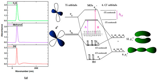Since titanium in the Ti4+ state has no electrons in its d orbitals, in the molecular orbital diagram in Figure 14b, we mainly observe the transfer of electrons from the π orbitals of chlorine to the vacant d orbitals of titanium. This transfer is due to the effect of the crystalline field, which divides the d orbitals into dt2g and deg levels. In a simplified model of a Ti4+ surrounded by six chlorine ligands in an octahedral geometry, dt2g orbitals are shown to influence the molecular orbital (MO) diagram significantly. These orbitals mix with the MOs centered on the metal, giving rise to linear combination orbitals adapted to the system’s symmetry. The lowest-energy electronic transitions correspond to the transfer of charge from the π orbitals of chlorine to the dt2g orbitals of titanium (transition A) and the deg orbitals (transition B). However, the experimental spectra do not simply consist of two bands separated by crystal field separation. The d orbitals of Ti4+ have a similar symmetry to the π orbitals of the ligands. The π orbitals have lower energy than the d orbitals of the metal, leading to the formation of ligand-centered MO bonds and the occupancy of the bonding t2g MO. In contrast, the antibonding t2g* π orbitals remain vacated.