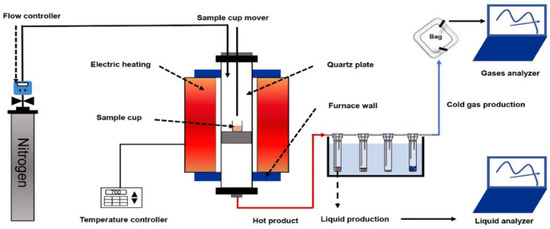 The vertical fixed-bed reactor system was used as the reaction system of the biomass pyrolysis process. The schematic diagram of the fixed-bed reactor used for pyrolysis is shown in Figure 1, which consists of a control unit, a reaction unit, a quartz tube, and a product collection unit. Before the experiment was carried out, pure nitrogen was injected to purge the air inside the quartz tube. The torrefied or raw corn stalk was placed in the quartz cup and transferred to the center of the quartz tube when the temperature was heated to the target temperature. At the same time, the fixed heating rate and the fixed carrier gas of N2 were maintained at 50 mL min−1 with an experiment time of 40 min. The solid, liquid, and gas products were collected after the experiment was completed.