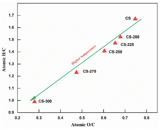 For the ultimate analysis, the contents of the oxygen element and hydrogen element gradually decreased. Specifically, the content of the carbon element was enriched to 56.16%, while the contents of the oxygen and hydrogen elements decreased to 20.89% and 4.63% when corn stalk was torrefied at 300 °C, respectively. In addition, the same trend was observed in the molar ratios of H/C and O/C of the corn stalk, as shown in Figure 2. The molar ratios of H/C and O/C hardly changed at low temperatures but significantly decreased at high temperatures. In particular, the molar ratios of H/C and O/C significantly decreased to 0.99 and 0.27, respectively, when the torrefaction temperature increased to 300 °C, which is comparable to conventional coals in China such as anthracite, lignite, and peat [3,36]. Overall, the results of the C, H, O and the molar ratios of H/C and O/C can be attributed to the dehydrogenation and deoxygenation reactions in torrefaction [21]. In addition, the dehydrogenation and deoxygenation reactions were also readily affected by temperature.