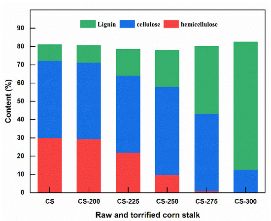 As for the C=C band (1535 cm−1–1444 cm−1), it corresponded to the aromatic structure of the C=C or benzene ring skeleton of the lignin. However, compared with other above-mentioned chemical functional groups such as O-H and C-H, the absorption intensity of the C=C band only decreased at 300 °C. This result indicates that the degradation of the C=C group of the lignin only occurred at high torrefaction temperatures [37]. Overall, these chemical functional groups of the corn stalk decomposed partially or completely, which confirmed the degradation of the chemical structure with increasing torrefaction temperature.