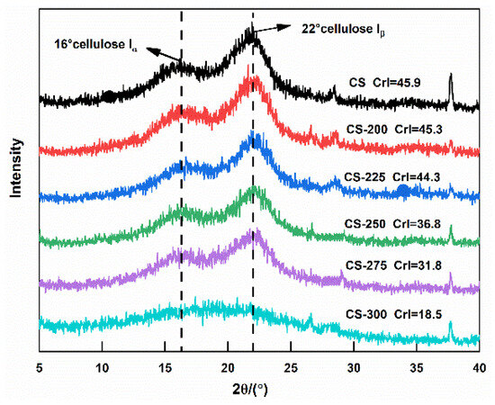 The fiber contents of the raw and torrefied corn stalk are shown in Figure 3. The content of lignin increased from 9.22% to 69.88%. In contrast, the contents of hemicellulose and cellulose decreased from 29.38% and 42.04% to 0.33% and 12.33%, respectively, with the torrefaction temperature increased from 200 °C to 300 °C. The variation in fiber content primarily depends on the structural nature. As for cellulose, because it is a linear long-chain carbohydrate polymer and contains a unique crystal structure [28,37], the variation of cellulose also can be investigated by the XRD analysis of the crystallinity index (CrI) of cellulose. Figure 4 presents the XRD analysis of corn stalk, which clearly shows that the CrI hardly changed under 225 °C while intensity decreased from 45.3% to 18.5% when the temperature increased from 250 °C to 300 °C. In addition, Kanwal et al. also reported that the cellulose decomposed at 275–300 °C in torrefaction because of structural liability [28]. Hemicellulose is a branched polymer with a low molecular weight and low polymerization degree [38,39], suggesting that hemicellulose is readily depolymerized at low torrefaction temperatures. In contrast, lignin is a complex phenolic polymer consisting of three phenylpropane monomers and a biopolymer with a three-dimensional network structure [39]. Thus, the lignin exhibits a stable molecular structure and high thermal stability with partial degradation at the higher torrefaction. The increase in lignin occurs mainly due to the formation of insoluble acid products with increasing temperature [40].
