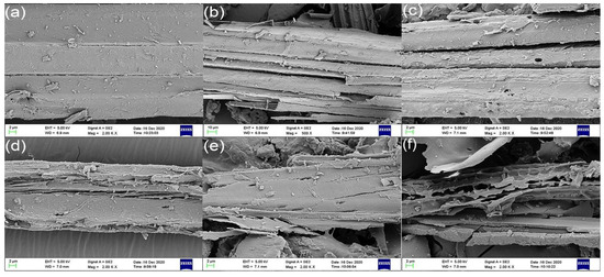 SEM images of corn stalk (a) raw, (b) torrefied at 200 °C, (c) torrefied at 225 °C, (d) torrefied at 250 °C, (e) torrefied at 275 °C, (f) torrefied at 300 °C.