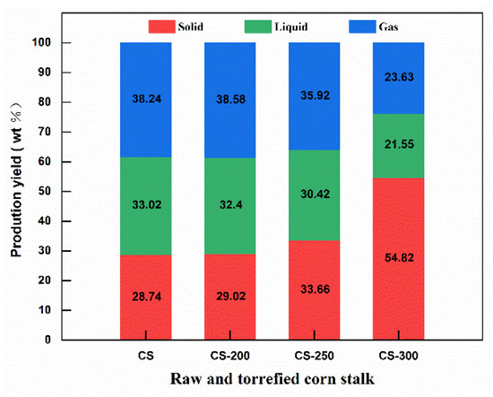 Figure 7 shows product distribution of the raw and torrefied corn stalk in pyrolysis. With increasing torrefaction temperature, the yield of solid products of corn stalk increased, while the yield of liquid and gas products of corn stalk gradually decreased. Particularly, when the torrefaction temperature increased from 250 °C to 300 °C, the yield of liquid products and gas products decreased from 35.92% to 23.63% and 30.42% to 21.55%, respectively. The sharp reduction in the yield of liquid and gas products is attributed to the degradation of the volatiles during torrefaction.