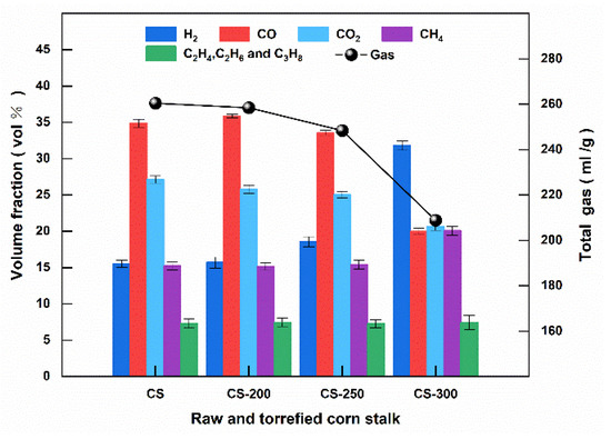 The influence of torrefied corn stalk on pyrolysis gas products is shown in Figure 8, with the increasing torrefaction temperature. When the raw corn stalk was torrefied at 300 °C, the content of H2 increased from 15.53% to 31.82%, whereas the content of CO and CO2 decreased from 34.88% and 27.11% to 19.97% and 20.70%, respectively. The torrefaction increased the molar ratio of H2/CO to 1.60 when the torrefaction temperature reached 300 °C. The carbon and oxygen functional groups of hemicellulose and cellulose decomposed primarily via the decarbonylation and decarboxylation reactions to release CO2 during pyrolysis [38,42]. The methoxyl group (-OCH3) of lignin produced massive H2 via the decarbonylation reaction during pyrolysis. Therefore, the difference in CO2 and H2 from raw and torrefied corn stalk is mainly attributed to the variation of hemicellulose, cellulose, and lignin contents in torrefaction. In addition, the total gas yield of torrefied corn stalk at high temperatures was lower than that of raw corn stalk.
